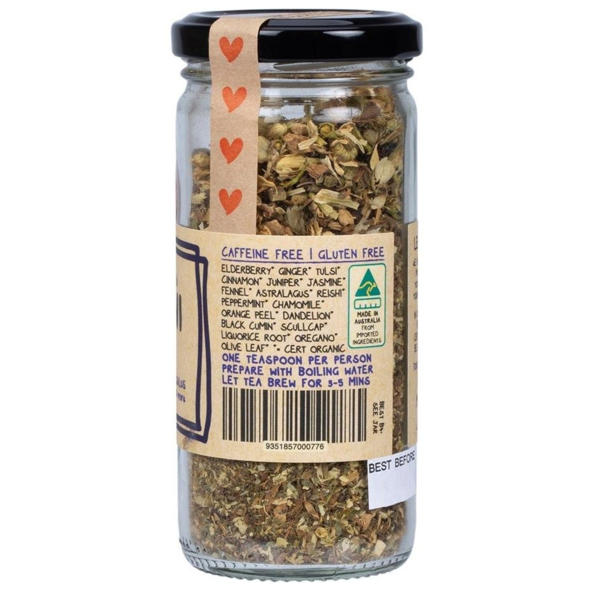 Elderberry*, ginger*, cinnamon*, tulsi*, juniper*, jasmine*, fennel*, astragalus*, reishi*, peppermint*, chamomile*, orange peel*, dandelion leaf*, black cumin*, liquorice root*, skullcap*, oregano*, olive leaf*